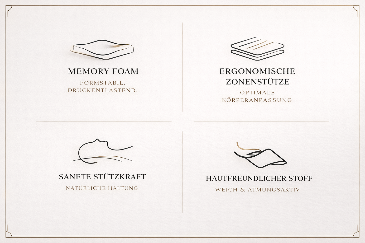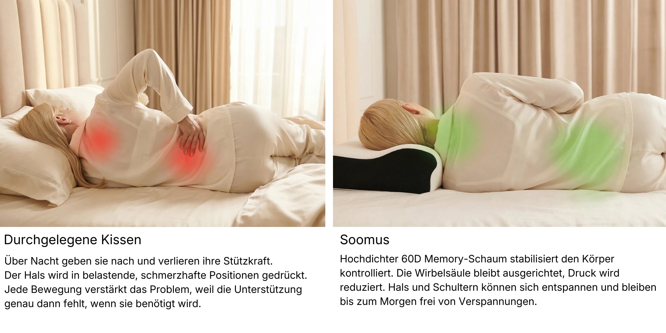 Schnarchen entsteht häufig durch eine falsche Schlafhaltung, die die Atemwege einengt. Soomus korrigiert genau das. Es richtet den Hals aus, stabilisiert die Schlafposition und hält die Atemwege offen, sodass Sie ruhig, tief und ungestört schlafen können. Eine kleine Veränderung mit großer Wirkung. Mehr Luft, mehr Ruhe, mehr Energie am Morgen.